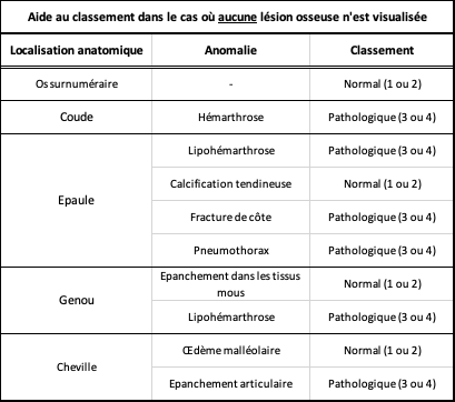 - Vous trouverez sur la page d'accueil du formulaire le tableau récapitulant les classements attendus pour les œdèmes ou épanchements articulaires.